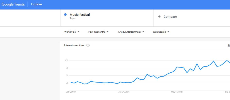 Google Trends is a free to use website that analyses the popularity of top search queries in Google Search across various regions and languages. The data uses an index rating where 100 is the maximum score. The global search for ‘music festival’ had an index of just 27 in October 2020 at the height of the coronavirus pandemic at a time when most people were more concerned about other factors like healthcare, lockdowns and job security for example.