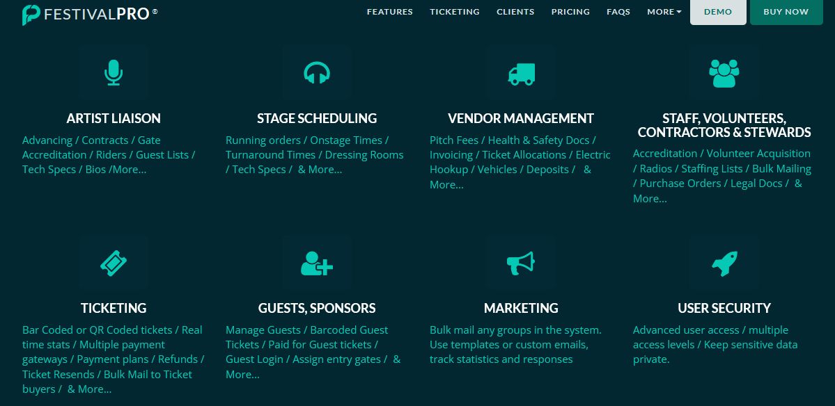 For music festival organisers planning their events using a software management platform like Festival Pro gives them all the functionality they need manage every aspect of their event logistics. The guys who are responsible for this software have been in the front line of event management for many years and the features are built from that experience and are performance artists themselves. The Festival Pro platform is easy to use and has comprehensive features with specific modules for managing artists, contractors, venues/stages, vendors, volunteers, sponsors, guestlists, ticketing, cashless payments and contactless ordering.