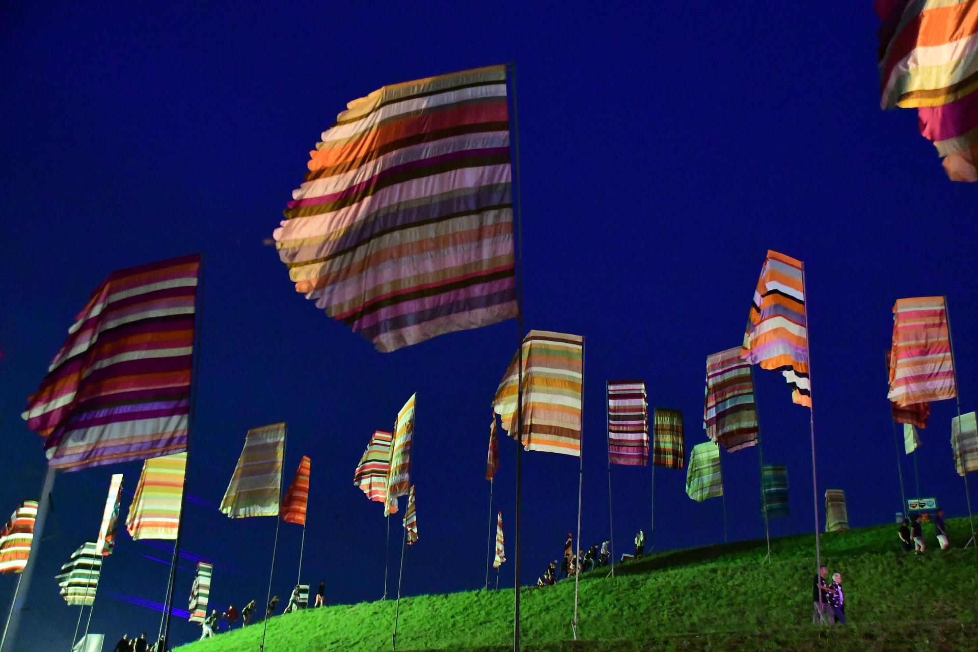 Careful consideration of materials used should be made to ensure that branded devices fit with the festival’s sustainability polices. Many banners and flags are made from Polypropylene, or polypro while some are made from Polyester. Suppliers can usually provide details of their own sustainability efforts particularly for PVC-free flex banners which are made from polyester canvas (also known as mesh), or PE woven material. A balance is often required to ensure durability against damage form adverse weather.